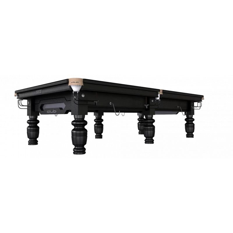 Bien-sûr, comment ne pas aborder le look de ce modèle de Pub Anglais. Son tapis vert posé sur ce cadre et ses pieds noir lui donne un réel aspect vintage de salle. À noter que les pieds et la caisse sont faits de bois d’acajou massif. De plus, les pieds comportent des moulures en faisant un modèle très élégant. Vous trouverez aussi des rappels de couleur dorés à travers les supports de queues intégrés sur les côté du Snooker Riley Club Noir 8 FT.